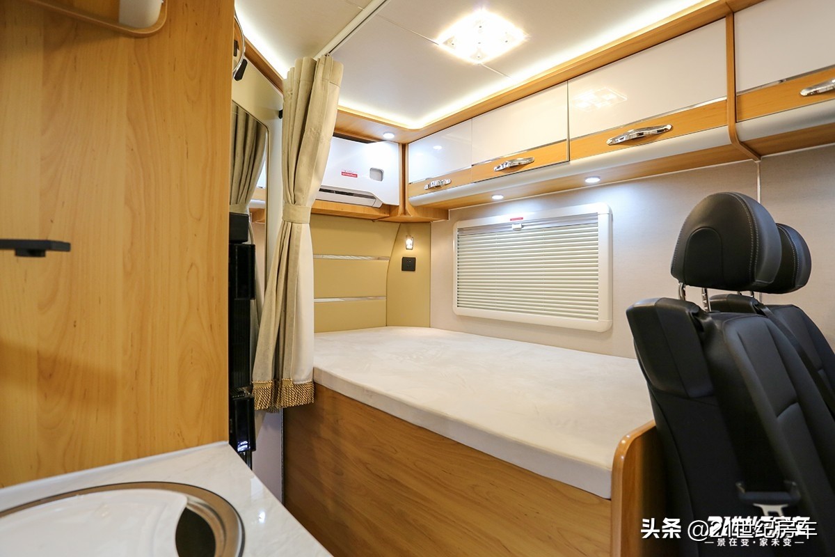 尾部纵床尺寸1900×1090(mm),上面配有高密度海绵床垫,厚度约15公分左右,舒适性还不错。这款车选用的是一款家用型变频空调,嵌入于床头顶部吊柜之内,尾床周围的灯光也很充足,包含了阅读灯、吊柜底部LED节能灯、顶部触控式灯盘以及隐私帘一周的LED灯带,足以让你享受到这种灯火辉煌的感觉。