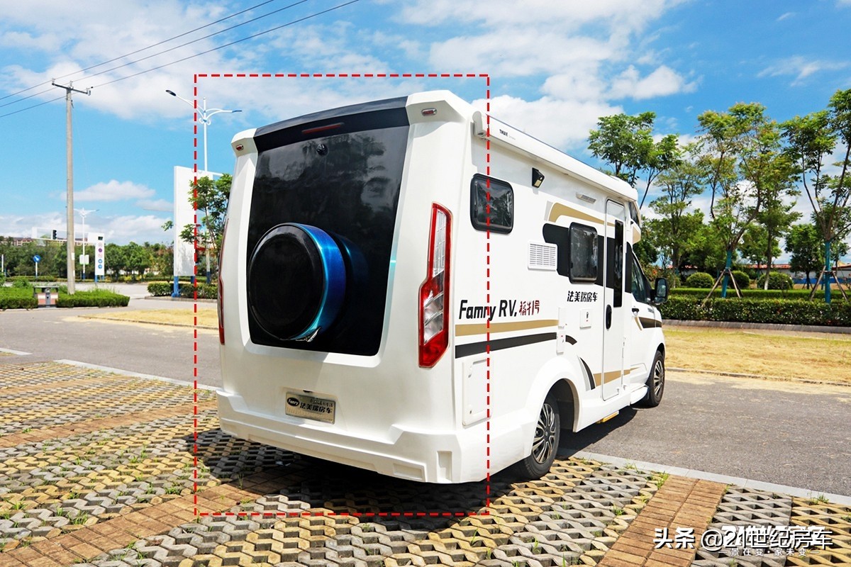 法美瑞福牛一号这款紧凑型房车基于福特新全顺二类底盘改装而来,整个上装部分采用的和自家平头轻卡房车一样的玻璃复合纤维一体结构,杜绝了漏水情况的发生。这款房车区别于其他同底盘C型房车的特征在于车尾部分,由于玻璃钢更容易塑型,整个车尾营造出S型的曲线,比平直的线条更显婀娜。福牛一号房车的外观尺寸为5995×2255×2800(mm),车身相对来说要灵活一些。由于福特新全顺并非房车专用底盘,后轮距有些偏窄,而C型房车必须要保证车内空间,那么整车后轮看起来要内收一些。